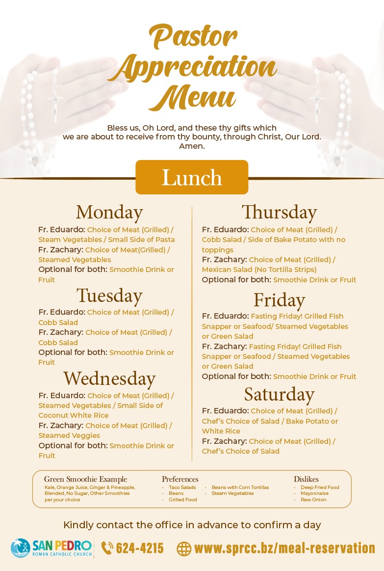 - The meal should feed our 2 priests, Fr. Eduardo and Fr. Zachary.